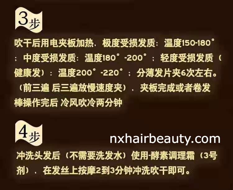 7. Wet the hair without shampoo, use Step 3 (Moisturizing Conditioning Cream) massage 2-3mins then rinse off.